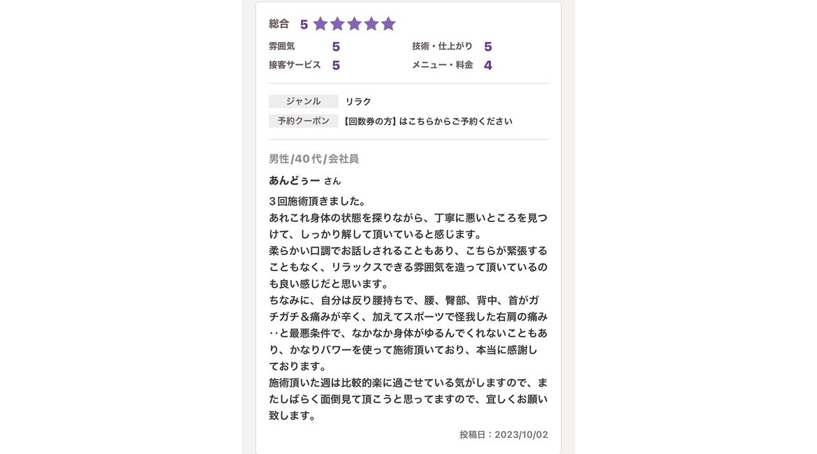 By the way, I have a swayback, and my lower back, buttocks, back and neck are all stiff and in pain. On top of that I have pain in my right shoulder from an injury I sustained while playing sports... it was a terrible condition, and it was difficult for my body to relax, so the treatment was very powerful and I am very grateful.